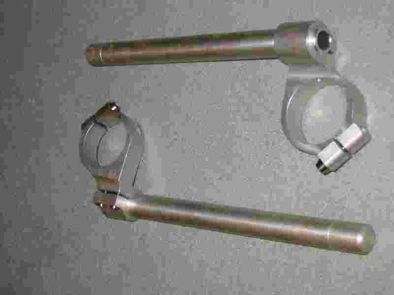 They are the raised ones from ExtremeBykeSports. They fitted the fork legs OK, but the standard 600SS brake reservoir clouted part of the clip-on.
